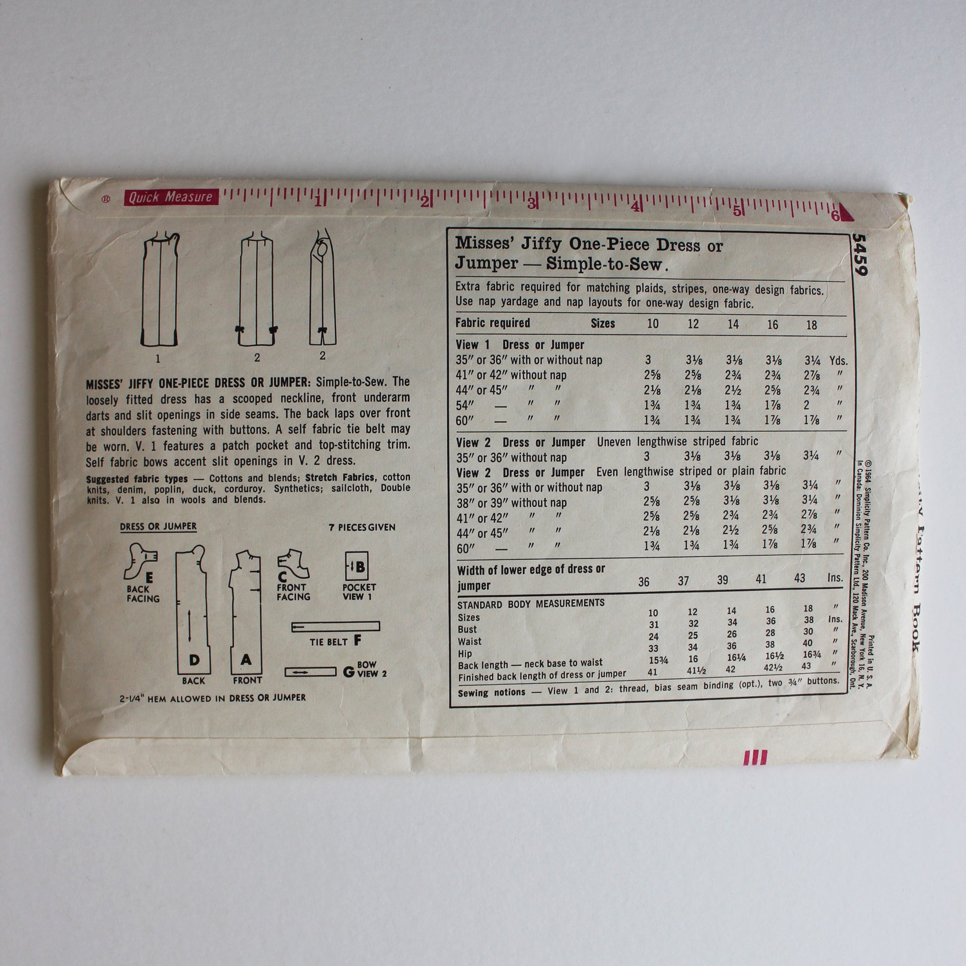 1964 Simplicity 5459 Sewing Pattern Misses Dress Jumper Size 12