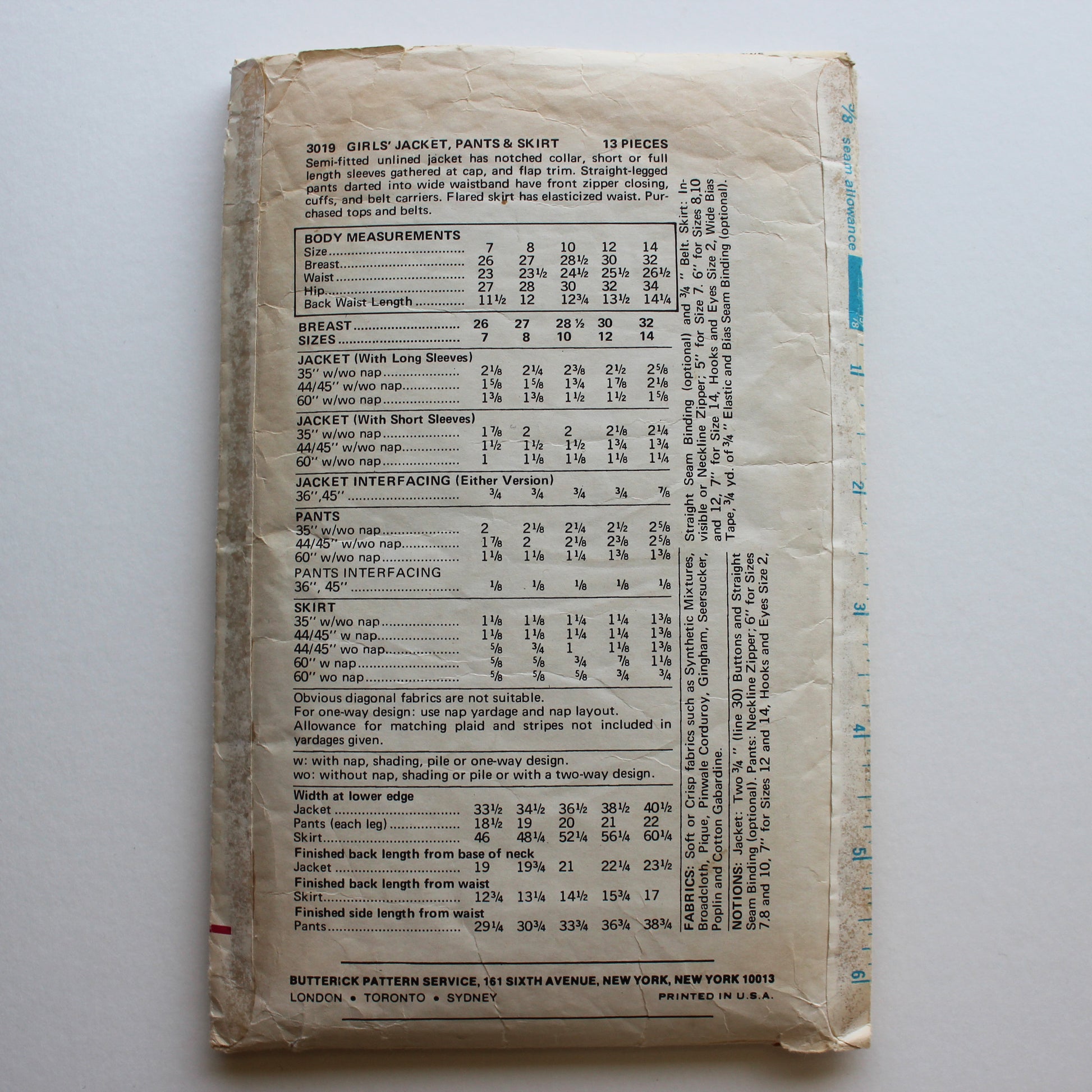 Pattern Envelope Description: Semi-fitted unlined jacket has notched collar, short or full length sleeves gathered at cap, and flap trim. Straight-legged pants darted into wide waistband have front zipper closing, cuffs, and blet carriers. Flared skirt has elasticized waist. Purchased tops and belts.