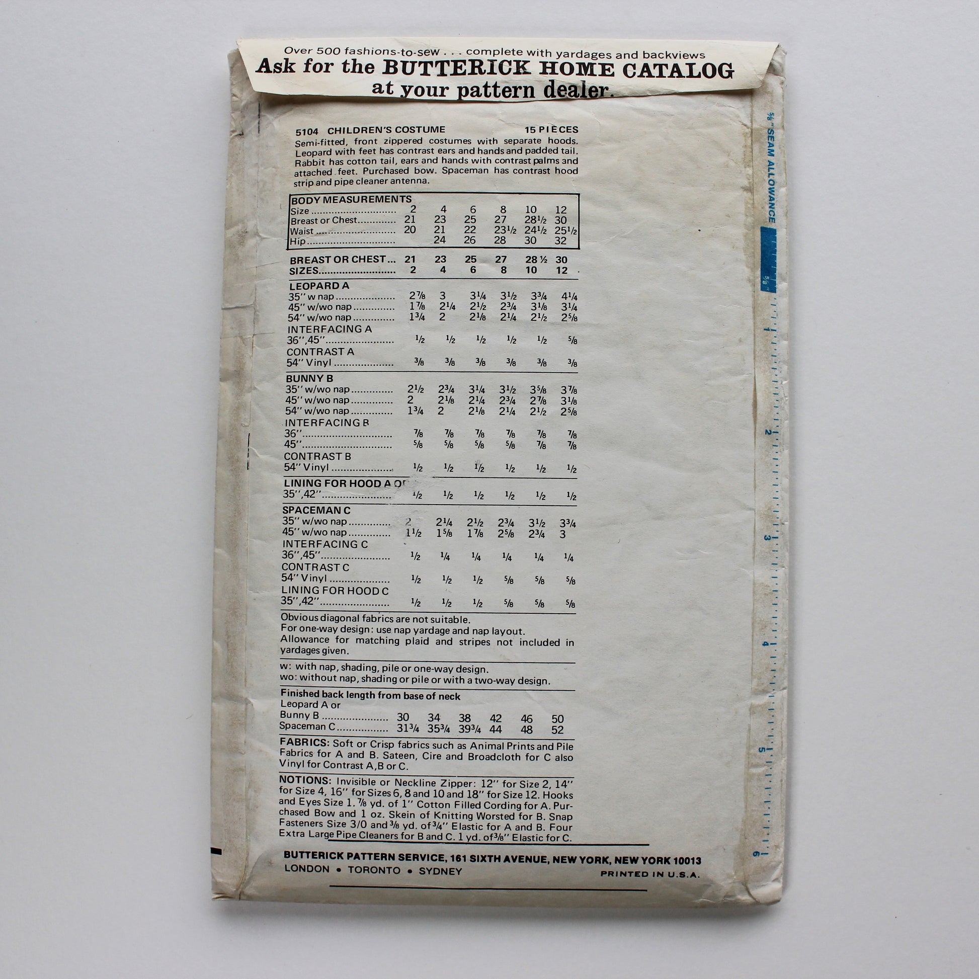 1970s Butterick 5104 Sewing Pattern Child Costume Leopard Bunny Spaceman Size 6