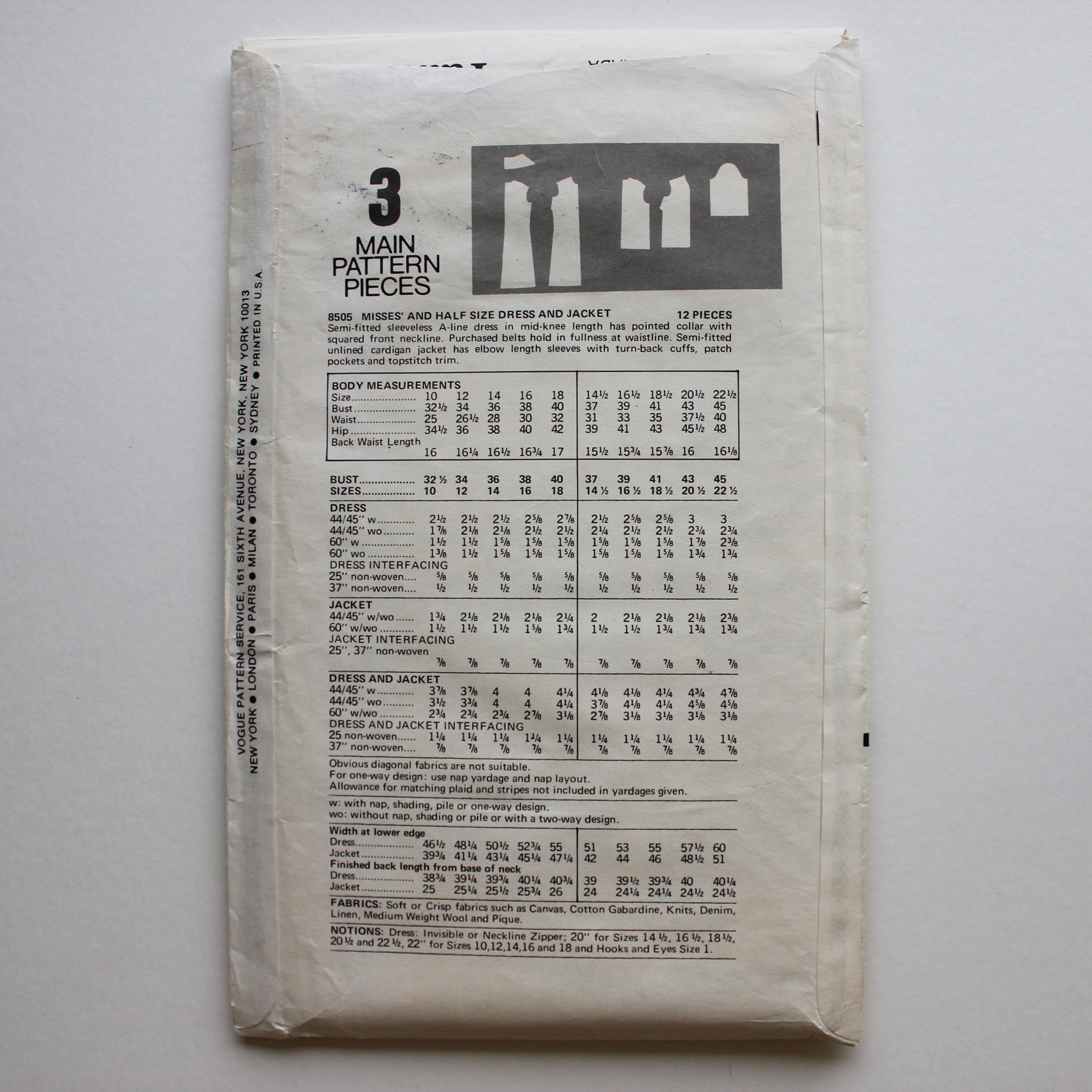 Pattern Envelope Description: Semi-fitted sleeveless A-line dress in mid-knee length has pointed collar with squared front neckline. Purchased belts hold in fullness at waistline. Semi-fitted unlined cardigan jacket has elbow length sleeves with turn-back cuffs, patch pockets and topstitch trim.