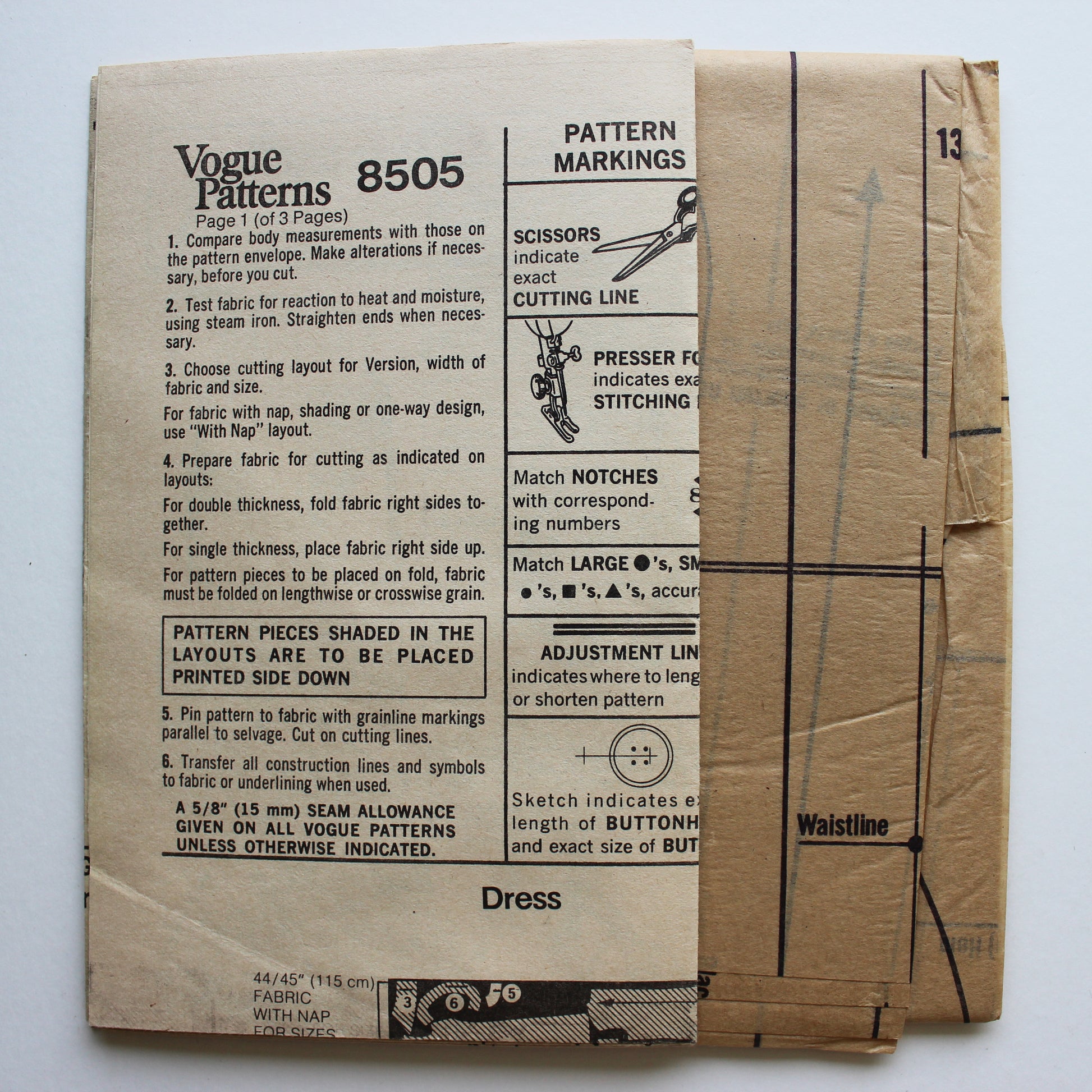 A General Note About Patterns: Depending on the age and storage conditions over the years, patterns may have discoloration and/or old paper odor. There may be wear, wrinkles and/or tears from handling and/or usage. Pattern pieces that have been cut and used may have pinholes, etc. Significant damage not visible in photos will be noted above.