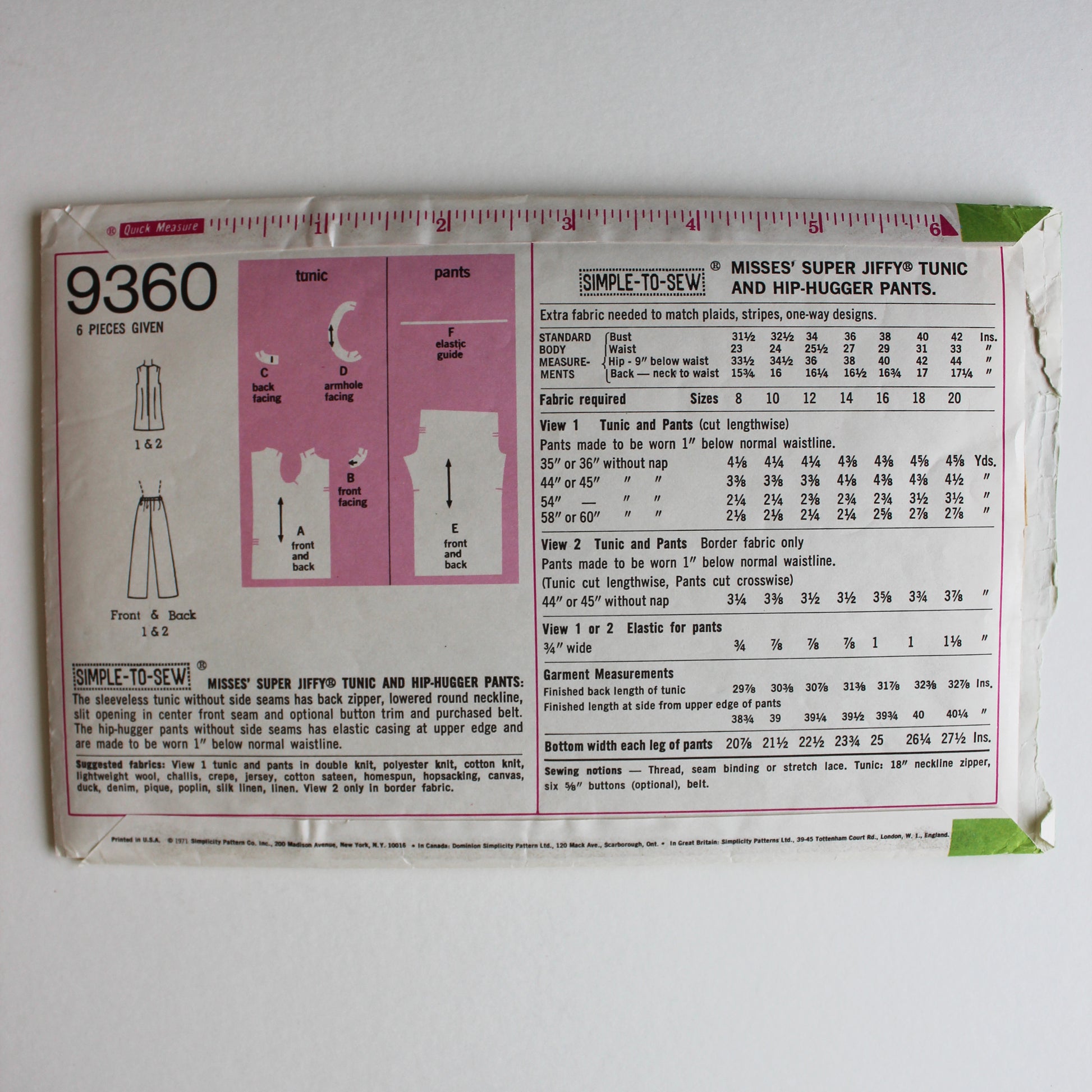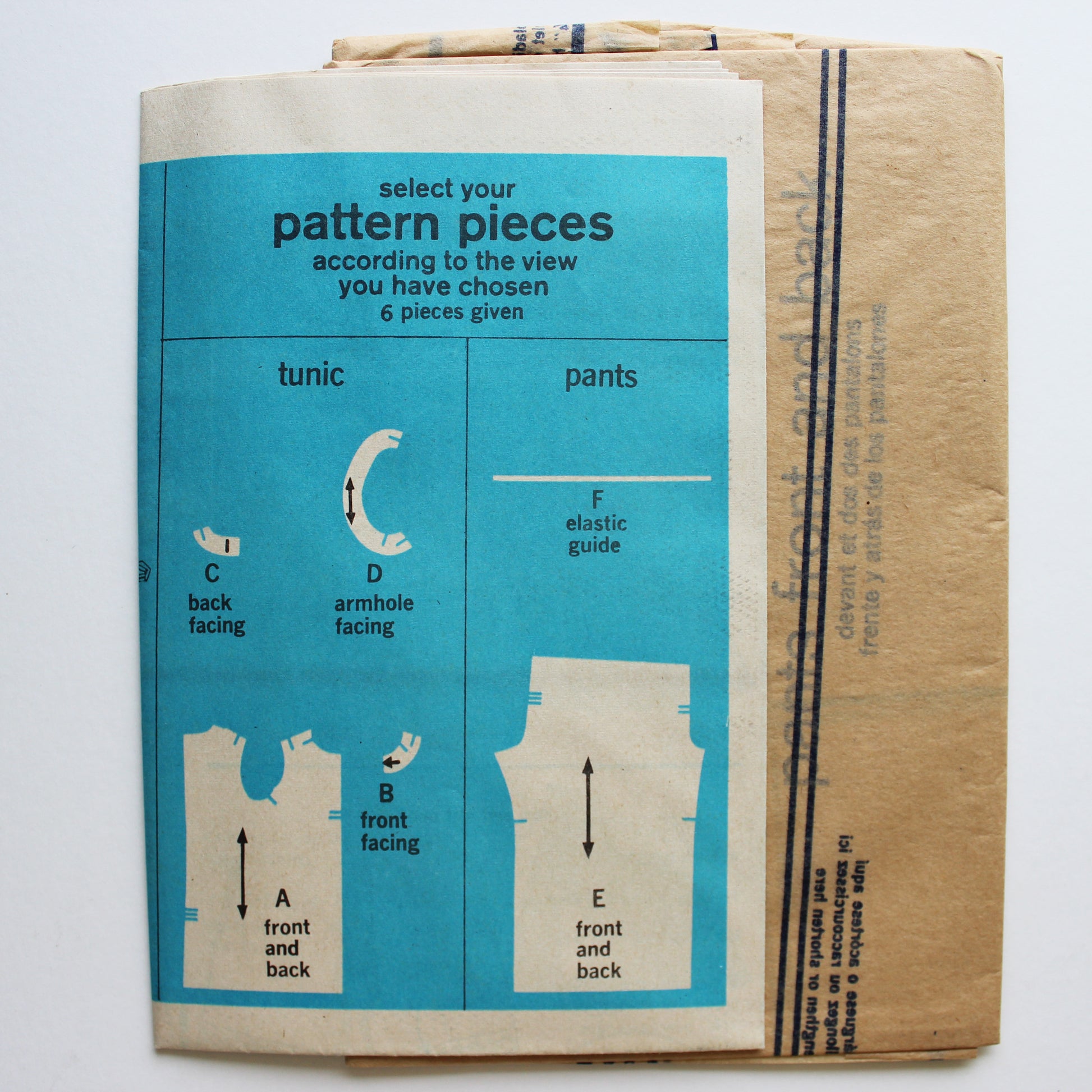 Pattern Envelope Description: The sleeveless tunic without side seams has back zipper, lowered round neckline, slit opening in center front seam and optional button trim and purchased belt. The hip-hugger pants without side seams has elastic casing at upper edge and are made to be work 1" below normal waistline.