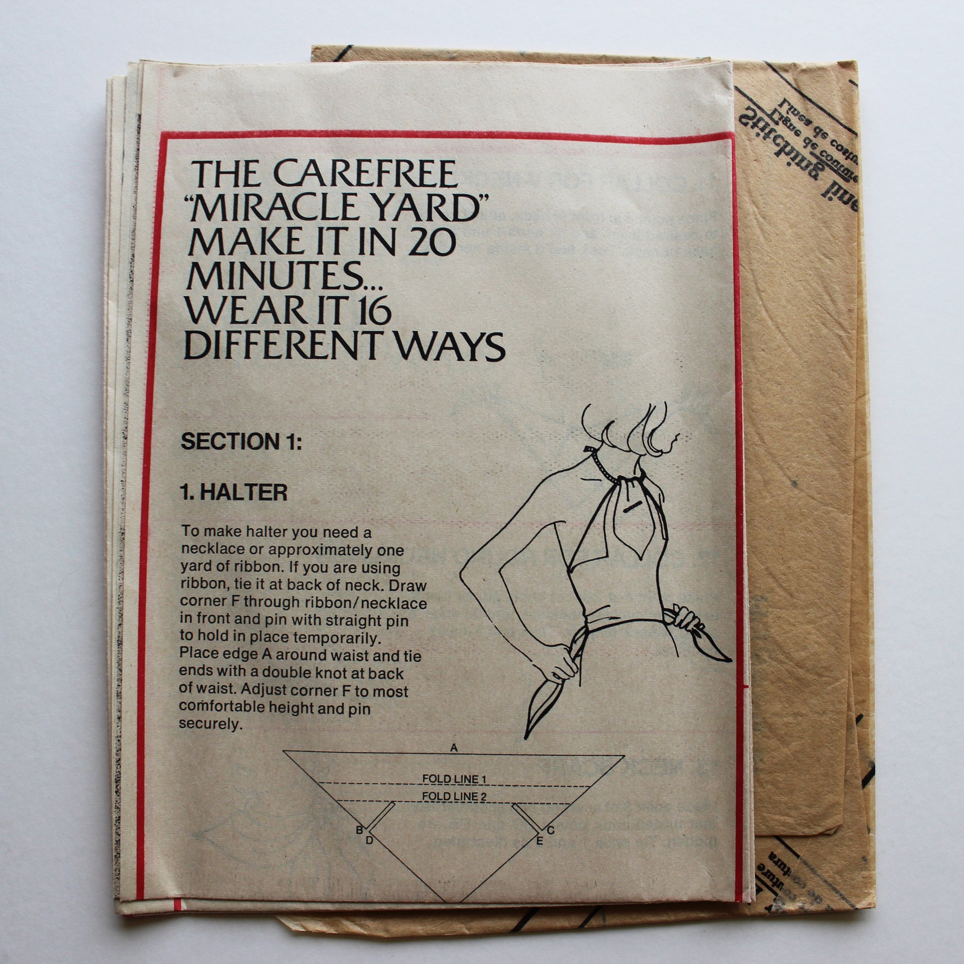 Pattern Envelope Description: The Carefree "Miracle Yard" Quick Change Accessory to Wear Sixteen Different Ways. Illustrated inside are the many ways to fold and tie the "Miracle Yard".