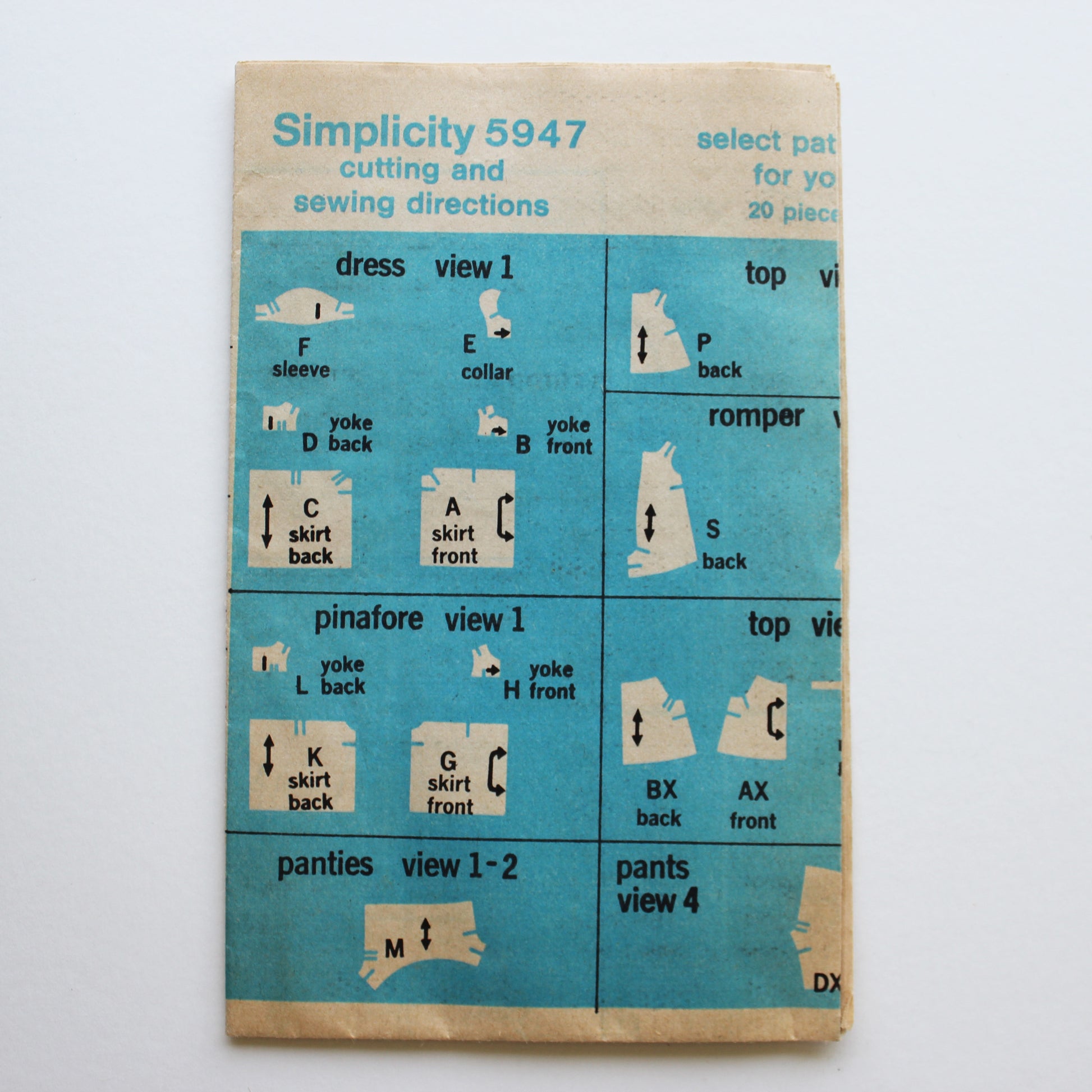 Pattern Envelope Description: The dress and pinafore V. 1 gathered to yoke have back snap closing and embroidered eyelet edging trim. The sleeveless and collarless pinafore has optional ribbon bow. The dress with contrasting collar has short set-in sleeves with elastic casings forming self ruffles. The sleeveless and collarless top V. 2 has snap back closing and contrasting tulip trim with rick-rack stems. V. 1 & 2 have panties with elastic casings at waistline and at leg edges forming self ruffles. The sleeveless and collarless romper V. 3 with back snap closing has elastic casings at leg edges. The top V. 4 gathered to bias bound neckline has long raglan sleeves with elastic casings forming self ruffles, back snap closing and rick-rack trim. Long pants V. 4 have elastic waistline casing.