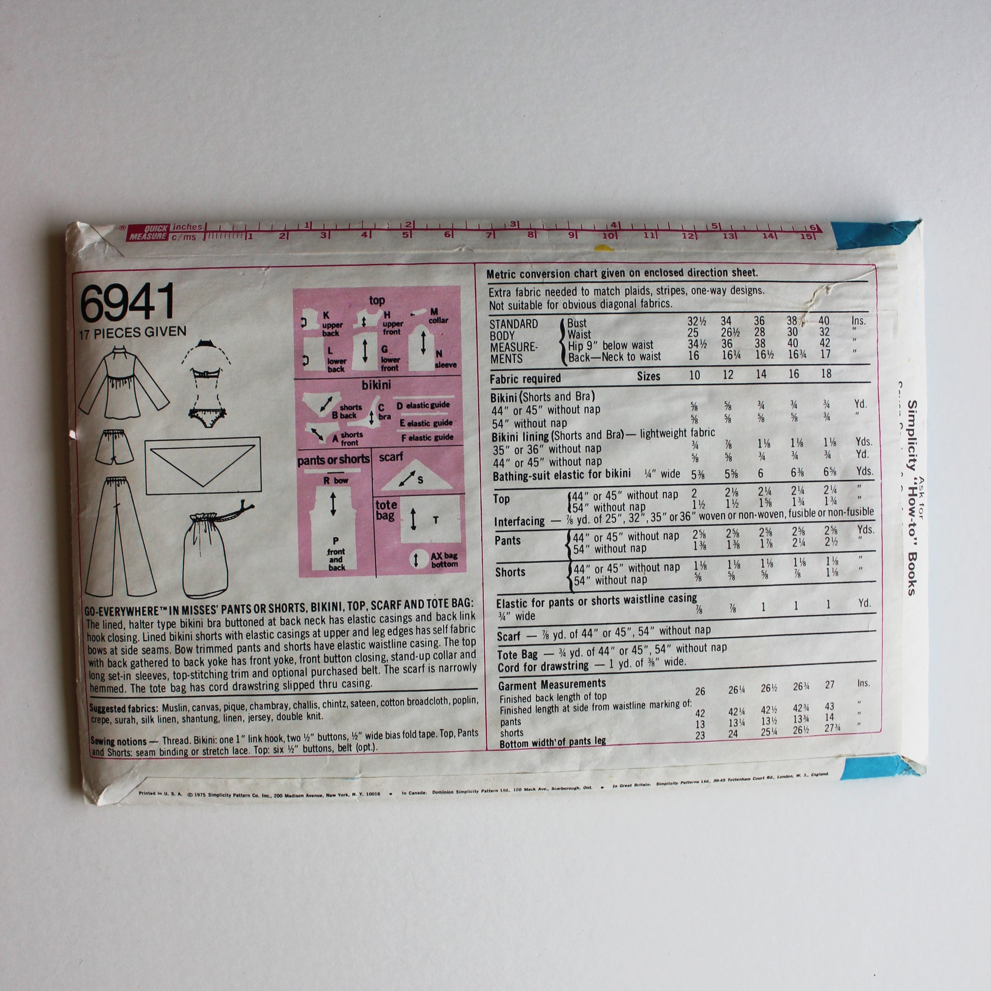 1975 Simplicity 6941 Sewing Pattern Misses Pants Shorts Bikini Top Scarf Tote Bag Size 12