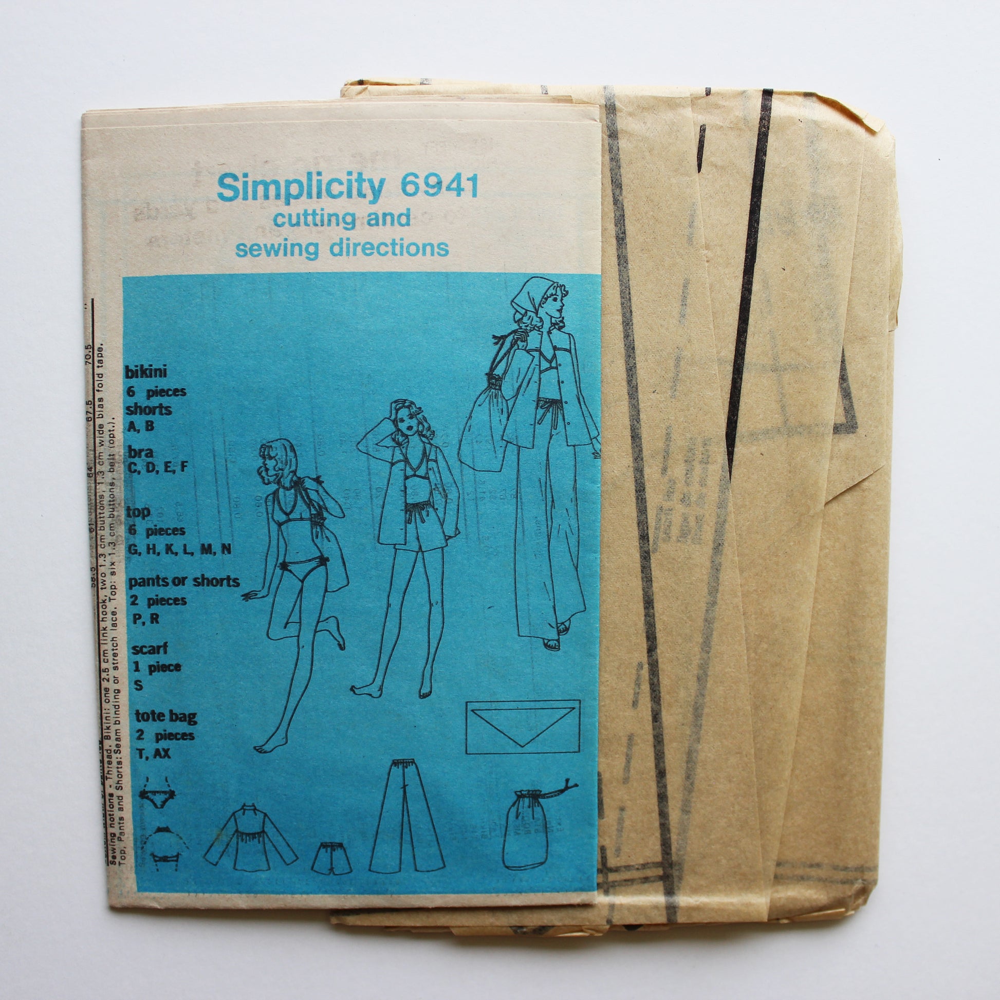 Pattern Envelope Description: The lined, halter type bikini bra buttoned at back neck has elastic casings and back link hook closing. Lined bikini shorts with elastic casings at upper and leg edges has self fabric bows at side seams. Bow trimmed pants and shorts have elastic waistline casing. The top with back gathered to back yoke has front yoke, front button closing, stand-up collar and long set-in sleeves, top-stitching trim and optional purchased belt. The scarf is narrowly hemmed. The tote bag has cord drawstring slipped thru casing.