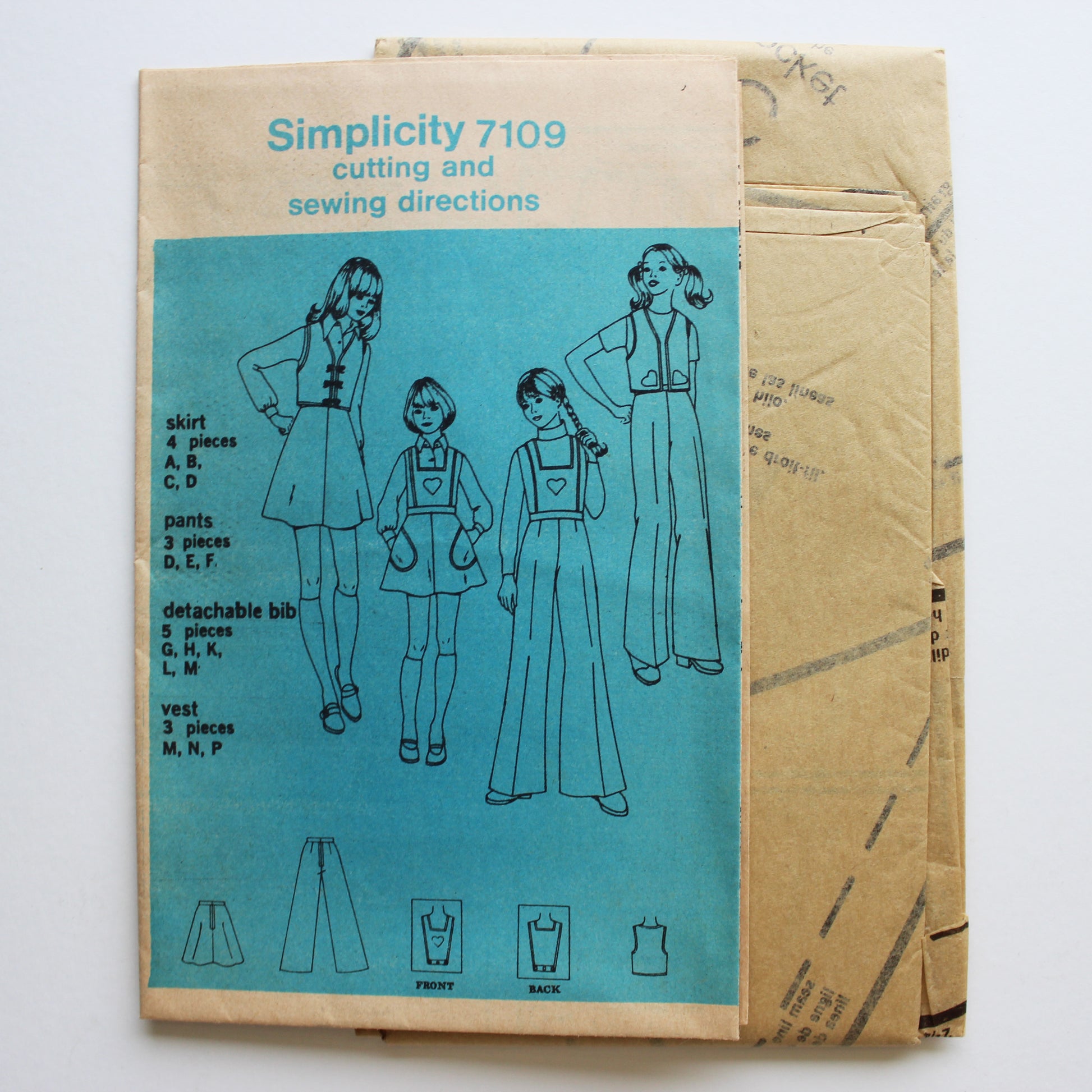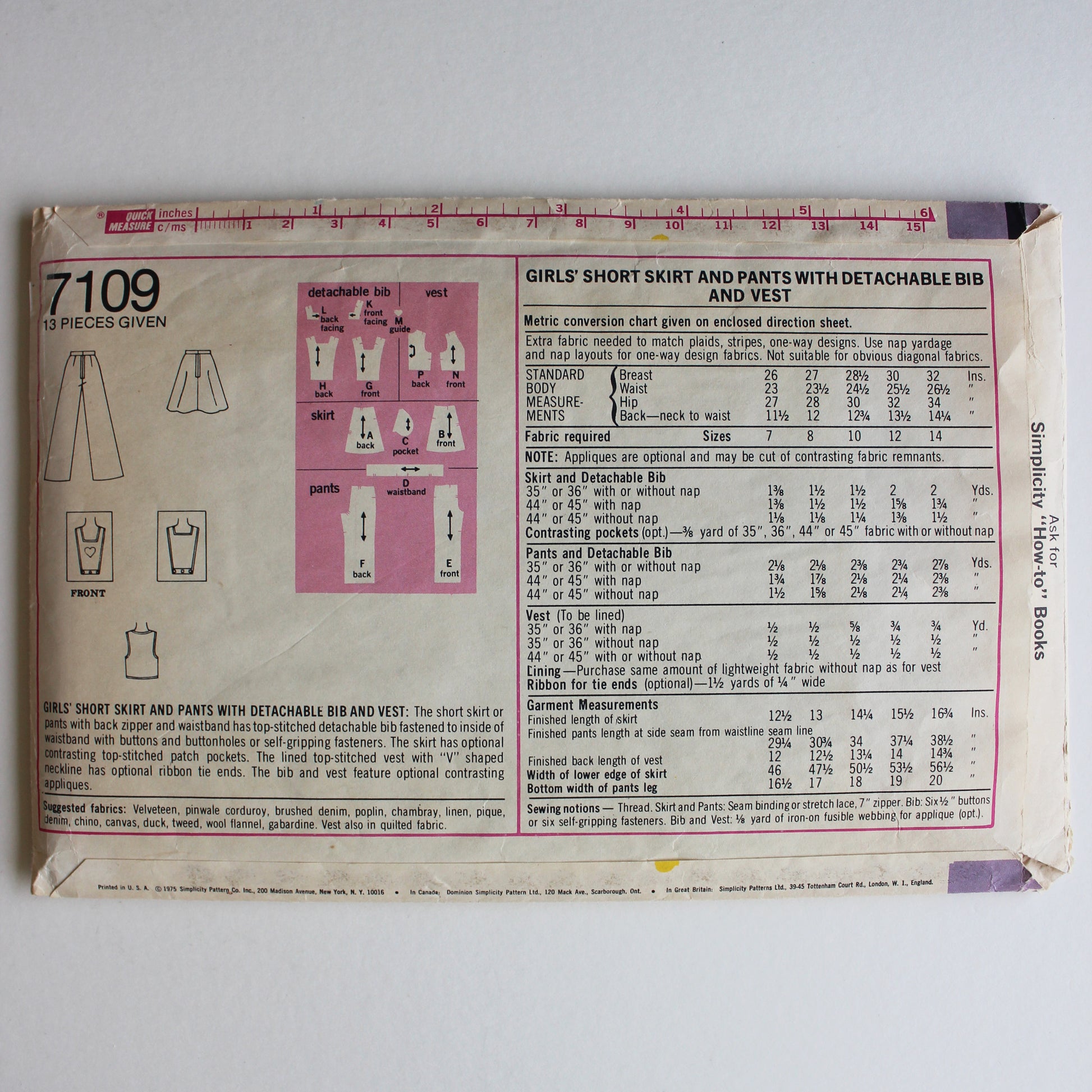 1975 Simplicity 7109 Sewing Pattern Girls Skirt Pants Detachable Bib Vest Size 12