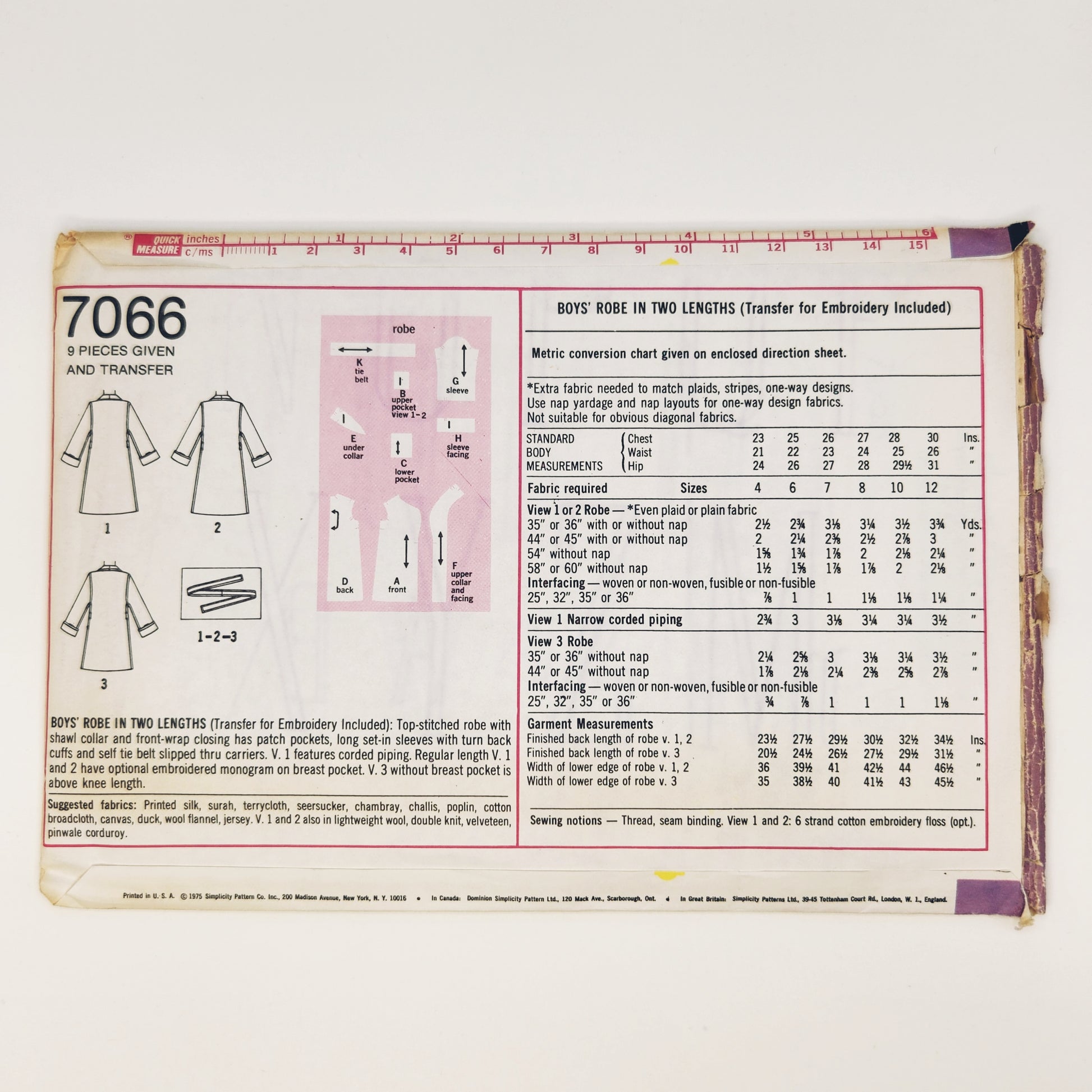 1975 Simplicity 7066 Sewing Pattern Boys Robe Two Lengths Size 6